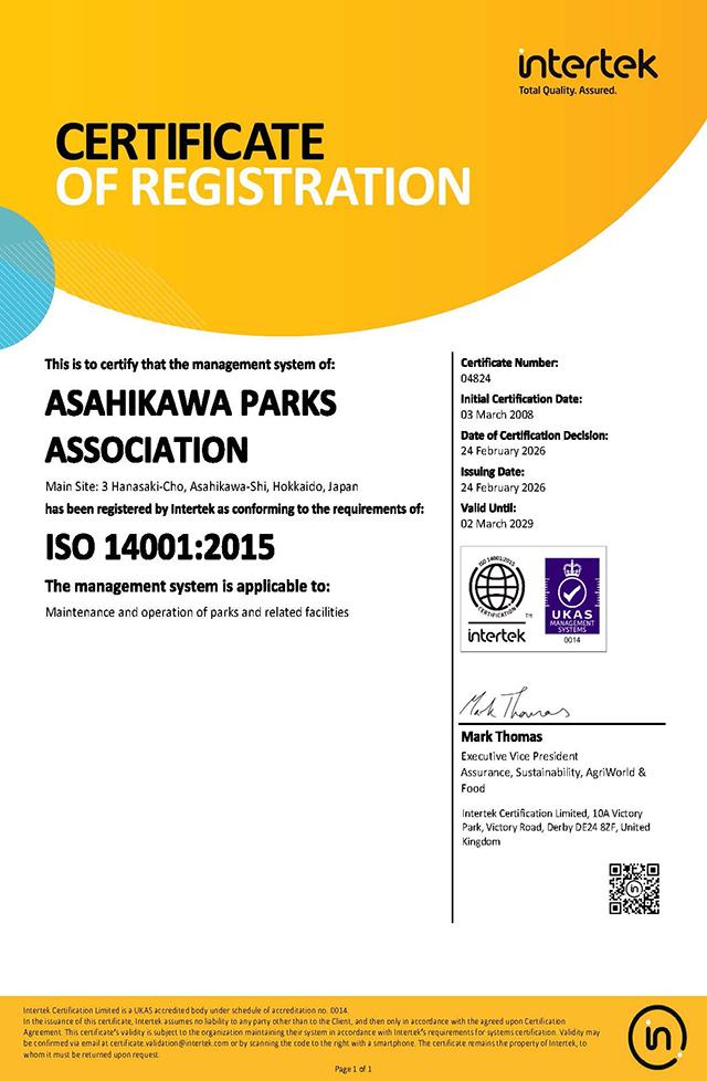 当協会は、市民の貴重な財産である公園緑地及び付帯施設を管理運営しているという立場から、また、失われつつある緑を保全育成しなければならないという 立場から、「環境マネジメントシステム(ISO14001)」の認定機関が認める審査登録機関の審査を経て、認証登録取得を取得し、当協会ができる範囲内での環境活動を実践してします。(ISO14001:2015)