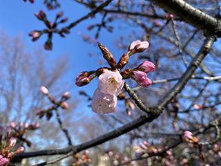 ●春光台公園の桜もやっと色づき始め、蕾も開いてきました。この天気が続けば全体の開花も近そうです。