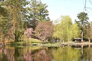 ●千鳥ヶ池の水面に、咲きこぼれんばかりのサクラが映り、まさに桜花爛漫の時を迎えています。薫風そよぐ園内を満開のサクラとともに、ゆったりとしたひと時を、ぜひお楽しみください。